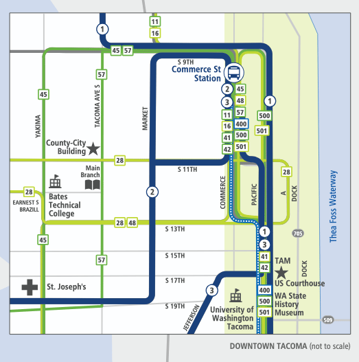 In Tacoma, there are three areas that are particularly challenging to visually untangle on Pierce Transit’s system map.