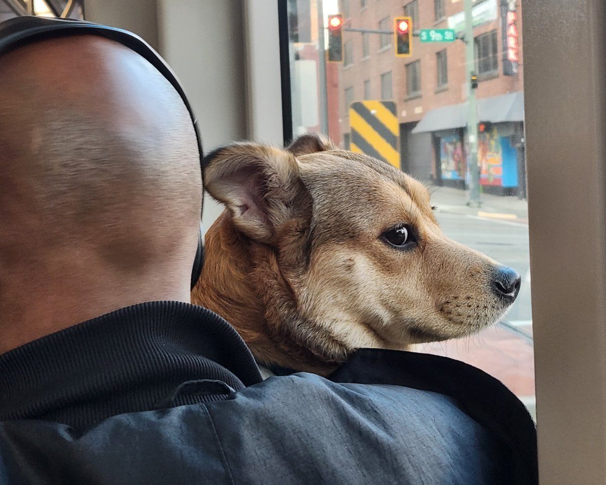 A dog peers out on Commerce Street in Tacoma’s Theater District from a T Line train headed to St. Joseph on December 19. (Transiterranean Photo)